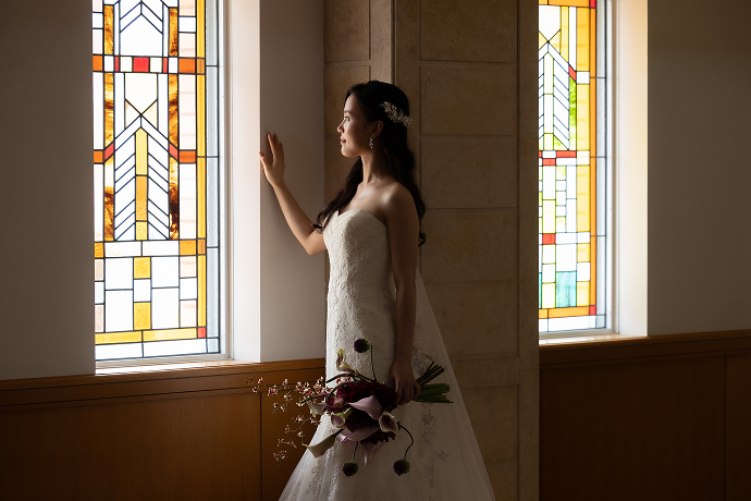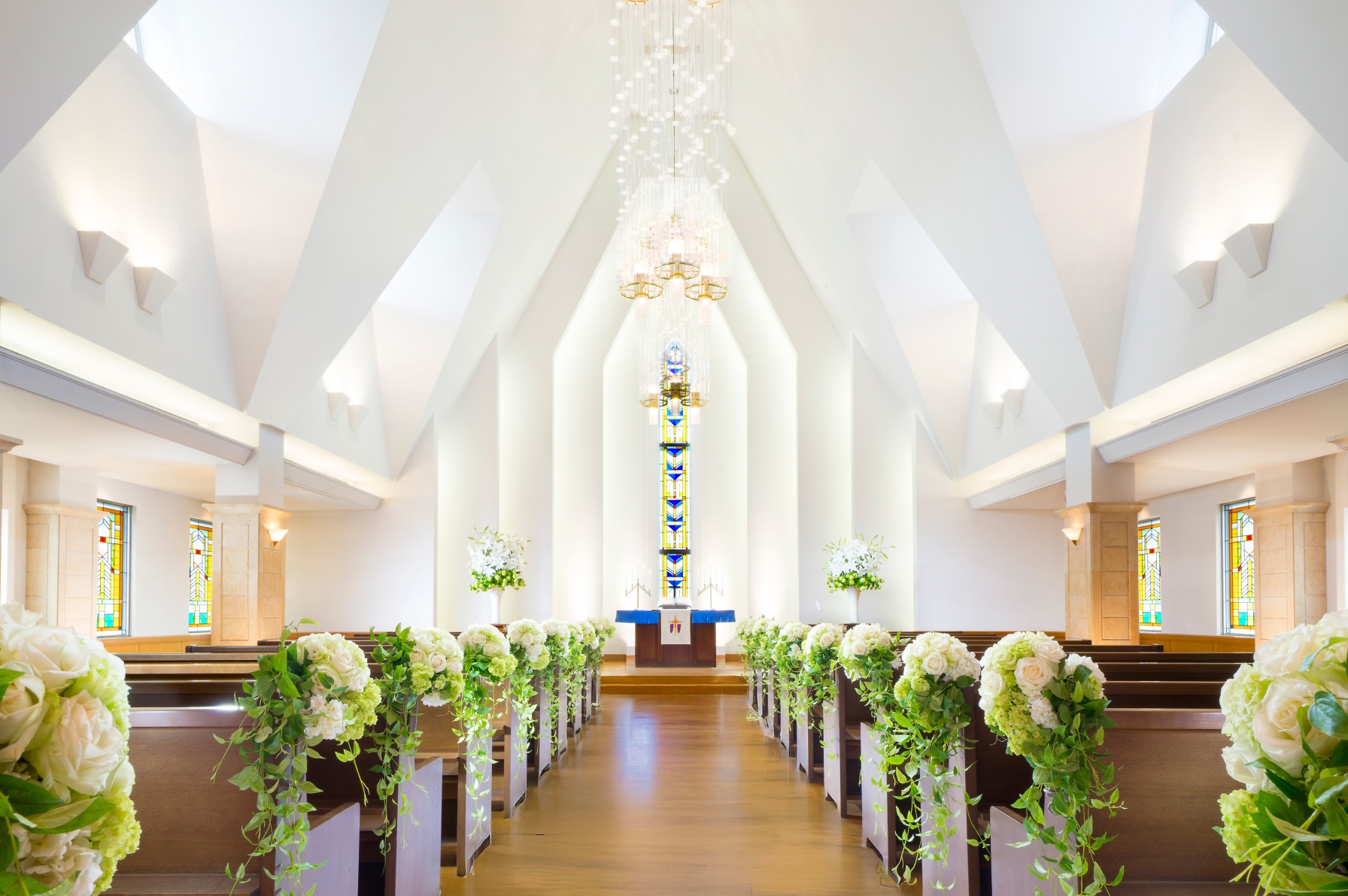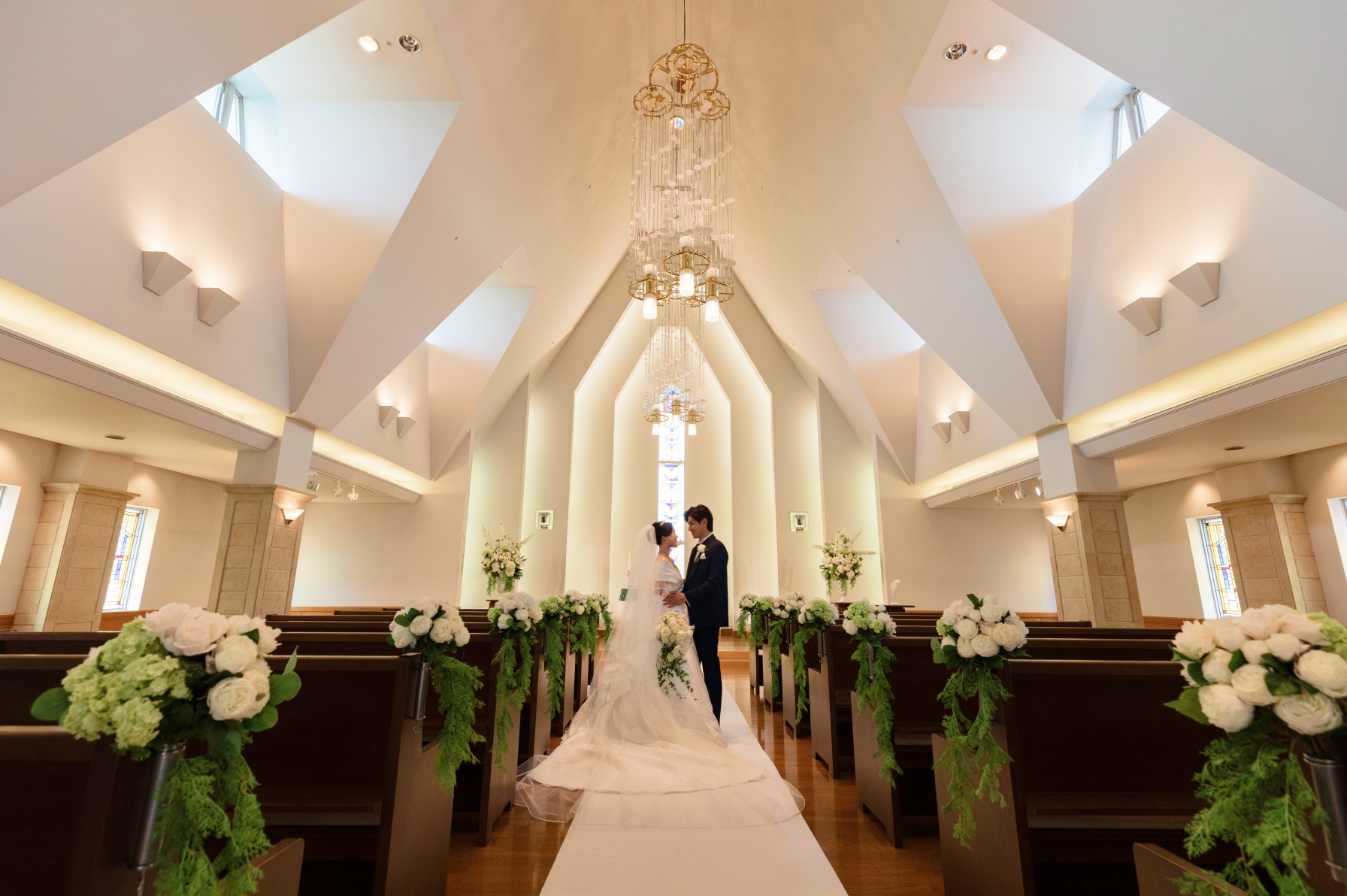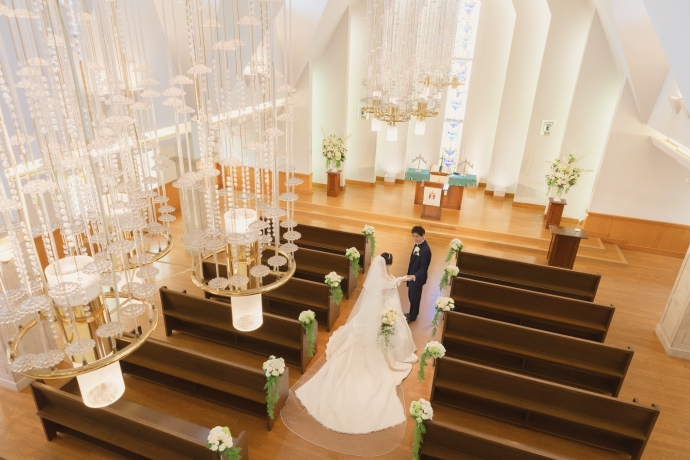 天井高9m、バージンロード15mの壮厳な雰囲気と、ステンドグラスから降り注ぐ光がおふたりを暖かく祝福してくれます。