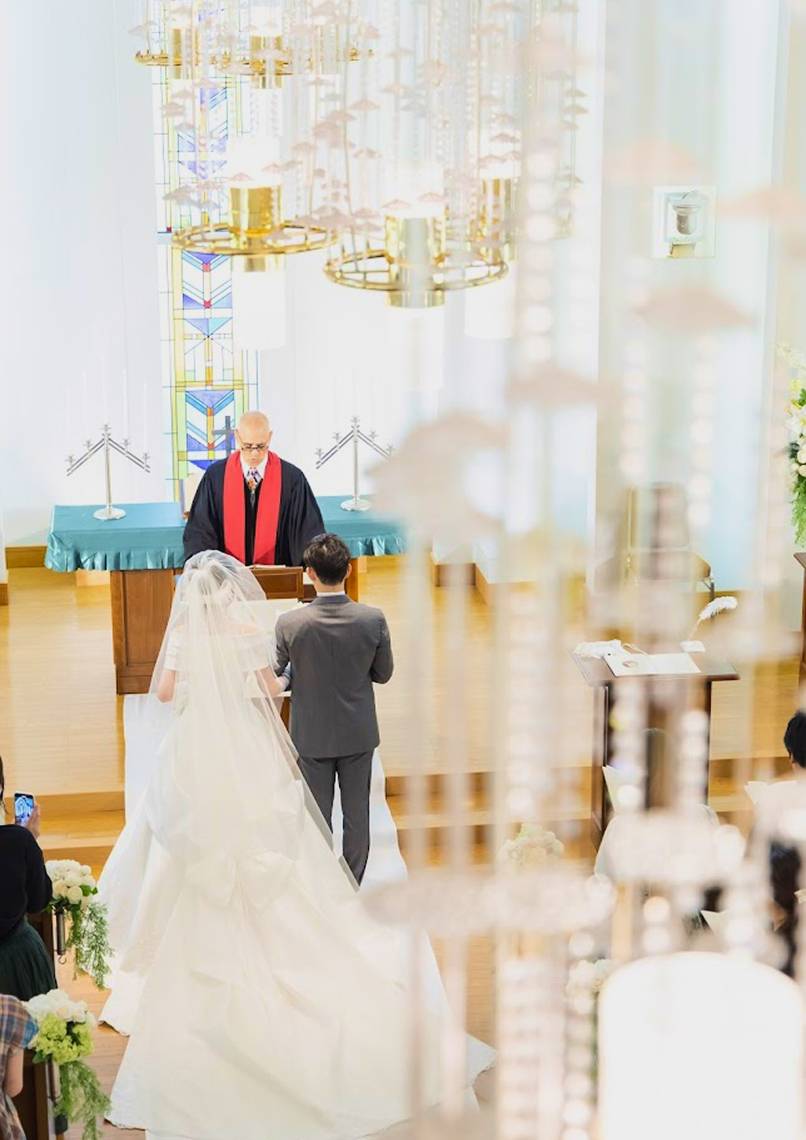 色鮮やかなステンドグラスから差し込む光がおふたりを温かく包み込みます。